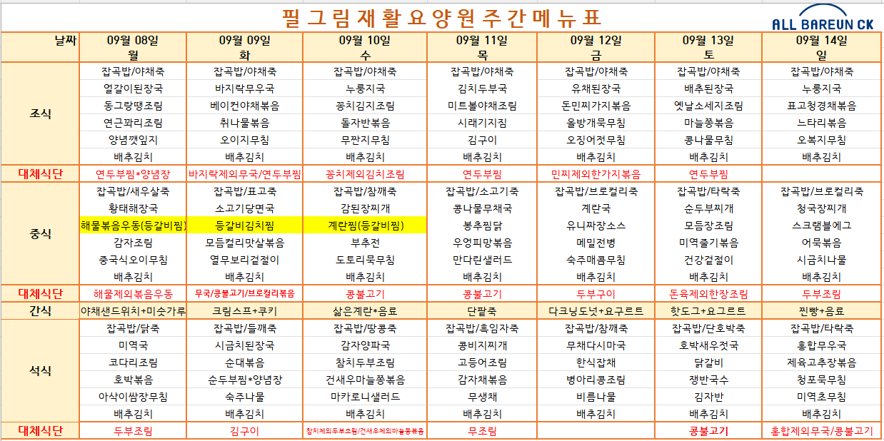 9월 2주 식단표